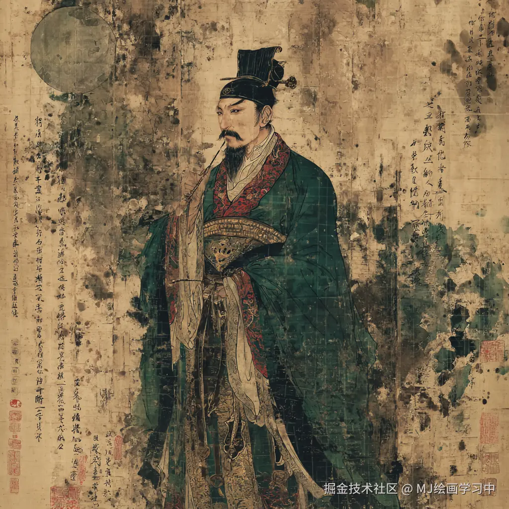 专为Midjourney生成东汉才子曹植全身像设计,融合历史细节与艺术表现力: