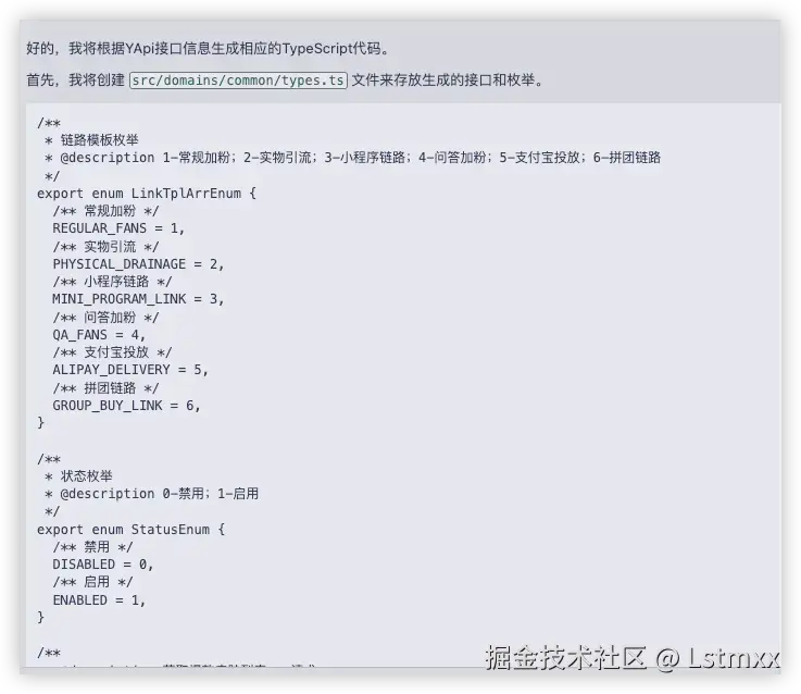 APIClient获取接口数据,然后精心设计一个 Prompt,将接口数据和生成指令一同发送给 LLM,最终返回 LLM 生成的 TypeScript 代码。 - 启动整个 MCP 服务,等待客户端的调用。