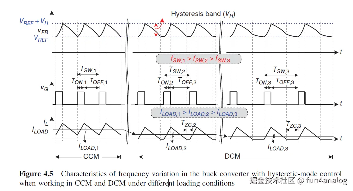 迟滞控制工作在DCM. 随着负载电流减少, toff增大, 因此频率降低, fsw3 < fsw2 < fsw1.