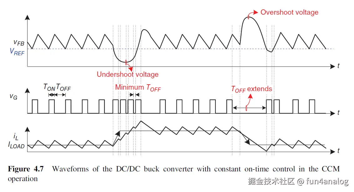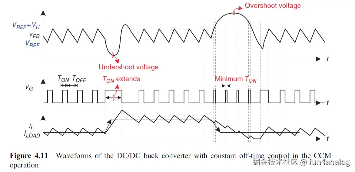 constant on-time稳态波形如下图所示. 当iload突然变大时, Vout跌落, 一旦Vfb<Vref, 就开始打拍. 连打几拍, 中间有min toff, 直到Vfb再次高于Vref. 占空比在发生瞬态立刻增加到最大值(由toff决定), 比起电压模/电流模的PWM通过EA控制相比, on-time控制响应要快得多. 当重载跳轻载时, Vout升高, toff变长,停止打拍, 确保负载把Vout拉下来. 在constant on-time开始时, 从重载跳轻载, Vout overshoot最严重, 因为on-time是预设的, 不能立刻关闭 (除非设计额外逻辑), 得等到这一拍on-time打完, 因此Vout overshoot很大.
