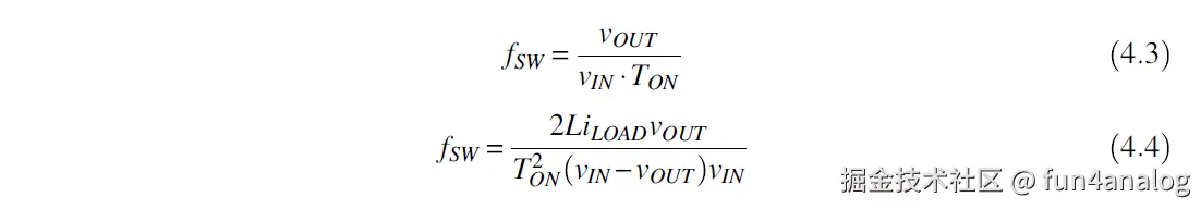 在CCM和DCM下开关频率如下. 注意在CCM下, 频率由Ton决定, 对于DCM, 频率和iLoad与电感值成正比.