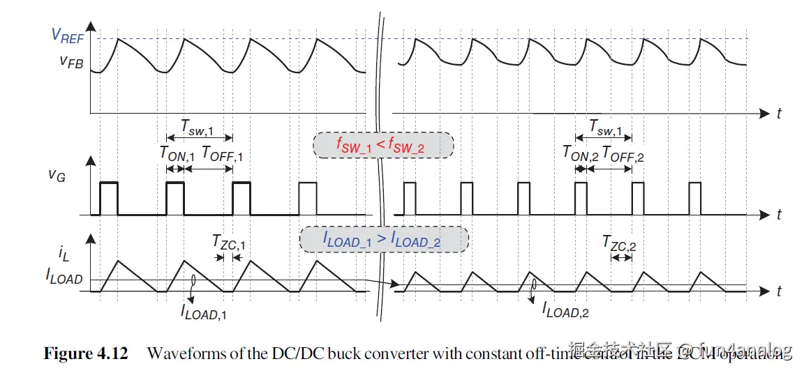轻载DCM下, 如下图Fig 4.12所示, iLoad1>iLoad2, peak电感电流I1>I2, Ton1>Ton2, 由于toff1=toff2, 因此fsw1<fsw2. 负载越低, 频率越高, 因此constant off-time轻载效率低, 不适合便携式设备. constant off-time+峰值电压控制具有constant 电流能力, 适合LED drivers.