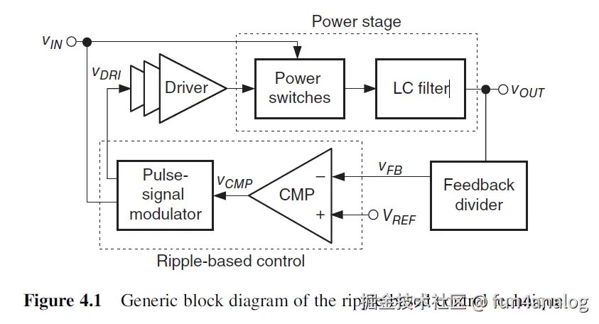 基于-纹波控制整体结构如下. Vfb和Vref进行比较, 调制产生PWM信号. 即检测Vout判断打拍是否足够, 从而改变PWM信号来控制Vout.