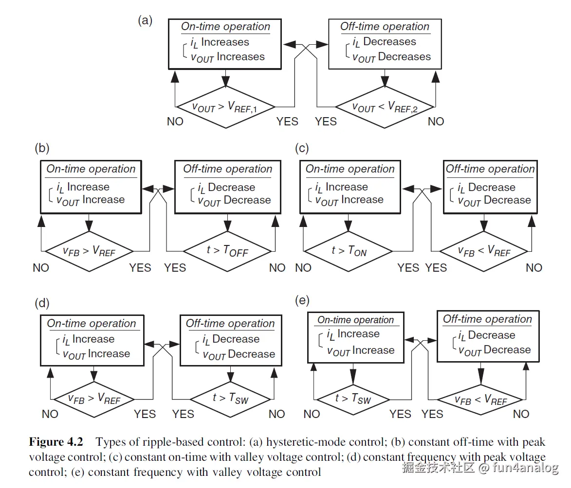 基于纹波的控制分类和基本工作逻辑如下: 通过Vout电压, on-time, off-time, 峰值/谷值电压, 或者是否有时钟分类.