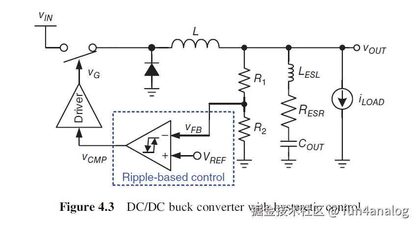 下面介绍buck的基于纹波控制方法, 功率级用异步即下管用diode替代, 另外Cout的ESR足够大, 因此输出电压Vout的纹波与电感电流成正比.