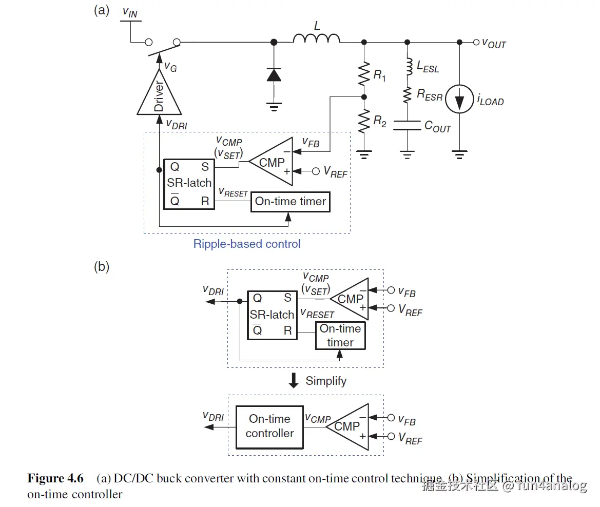 Fig 4.6(a) (b)展示了buck的constant on-time结构图. Vfb<Vref, 比较器CMP翻高, VDRI即Q翻高, 开启上管, 电感电流和Vout增加, 同时on-time timer开始计时, 经过preset on-time后, Vreset翻高, 上管关闭, 进入off-time阶段, 导致电感电流和Vout下降. 直到Vfb再次低于Vref, 开启下一个周期.