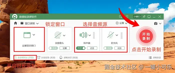 步骤2:进入 “窗口录制” 的基础设置界面后,选择要录制的窗口,同时调节好摄像头、扬声器和麦克风的相关设置。另外,还能在软件下方开启 “按时长录制” 功能。一切准备妥当后,点击 “开始录制” 按钮,即可开始录制视频。