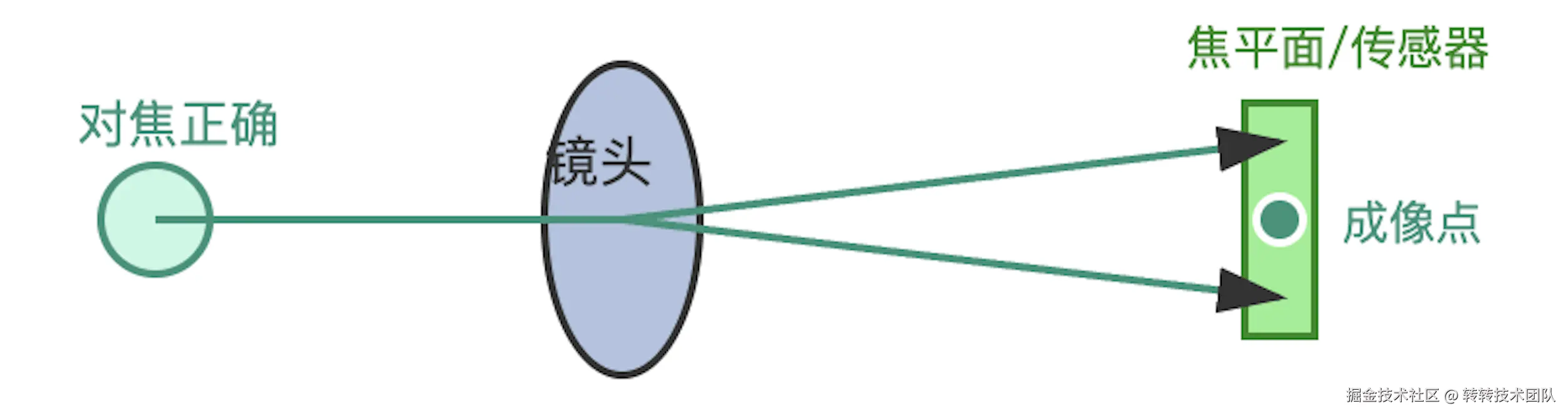 对焦正确:焦平面与传感器重合,成像点落在传感器上,成像清晰