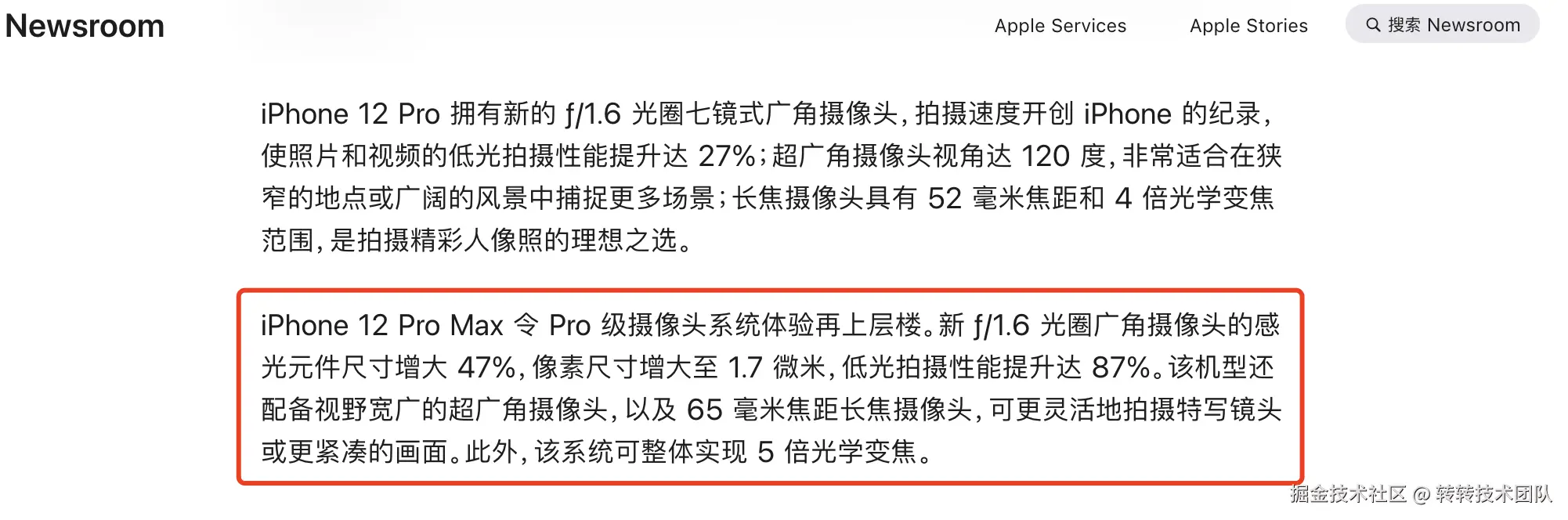 从 Apple 官网的介绍中可以看到,iPhone 12 Pro Max 的主摄感光元件尺寸相对 11 Pro Max做了升级。