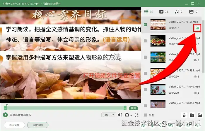 步骤4:录制完成后忘记视频的保存位置也没关系,我们可以打开 “历史录制记录” ,找到需要打开的视频,然后点击 “打开文件所在位置” ,就可以直接找到视频文件了。
