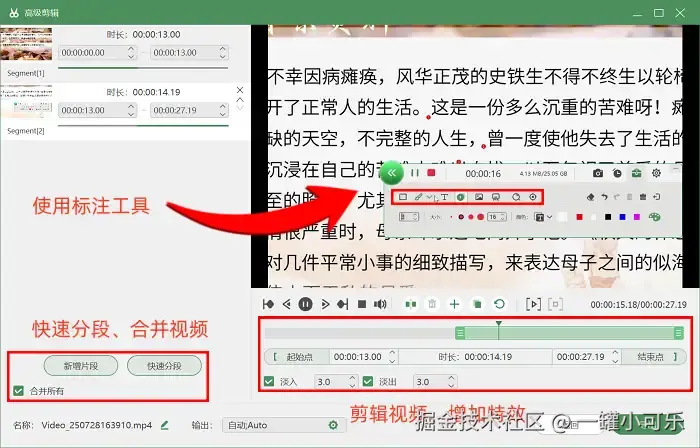 步骤3:在录制的时候,我们可以直接使用软件的标注工具进行标注。在录制结束后,软件会自动进入预览界面,如果觉得视频有需要编辑的地方,比如剪辑掉多余的部分,就点击 “高级剪辑” 进入编辑模块,这样可以进行分段视频、添加转场特效等操作。