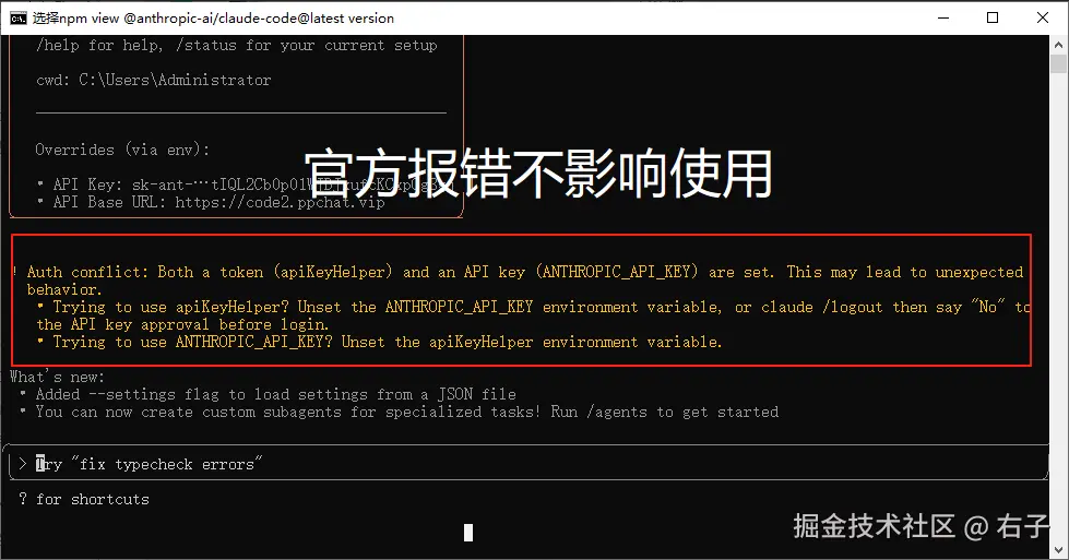 则进入到 claude code里了,然后应该会识别出你是API KEY用户,直接就可以开始对话使用。