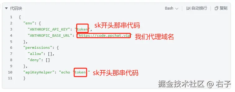 上面的配置配置复制设置中,同时需要把平台生成的token替换里面的token占位符的内容.