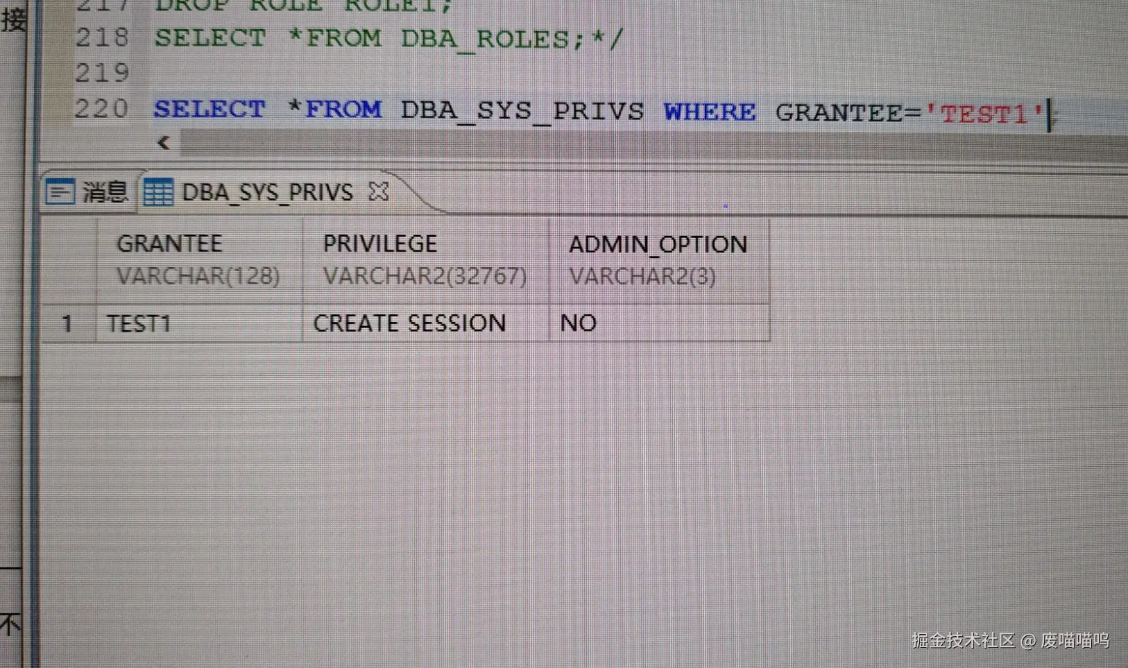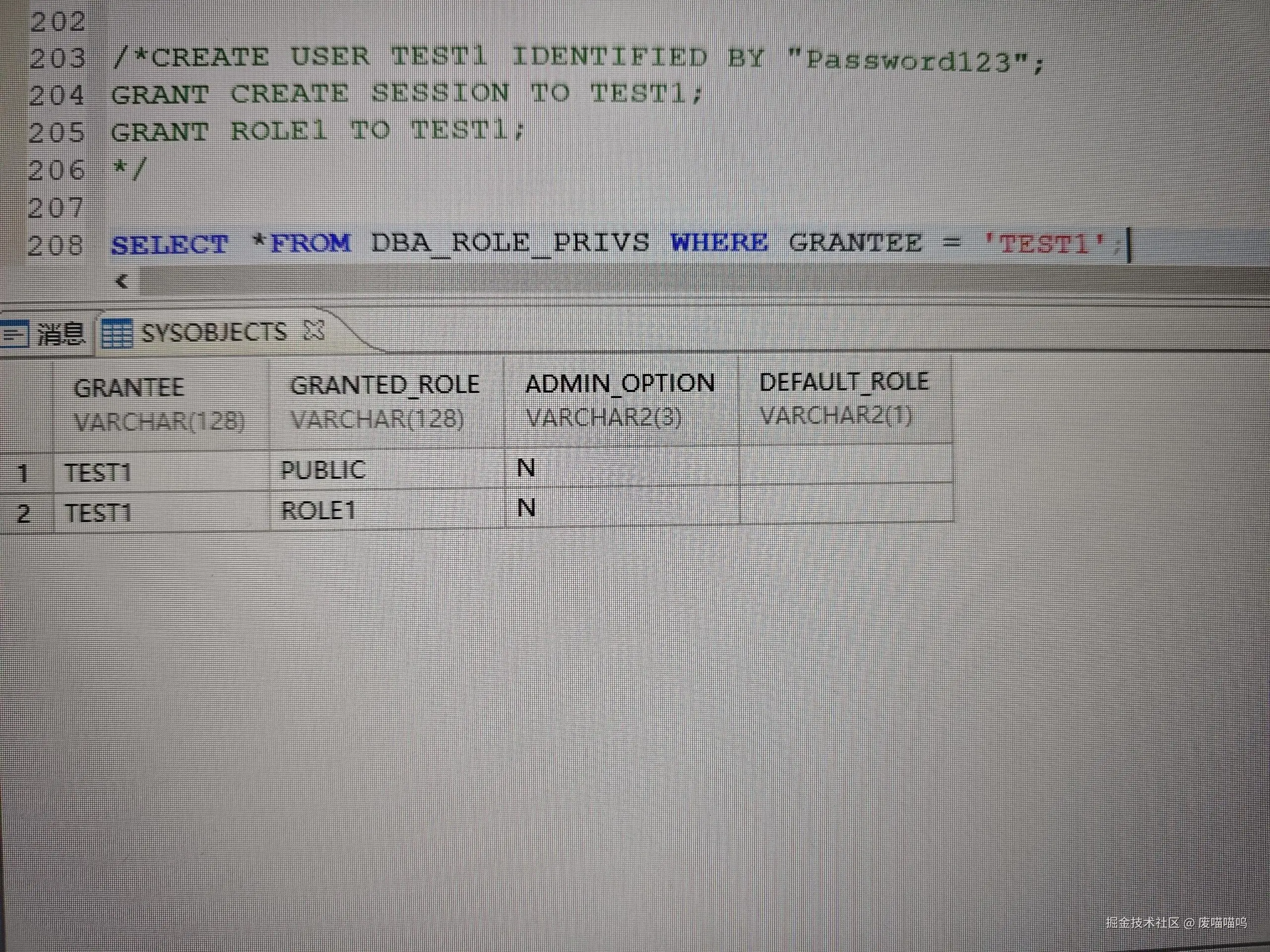 ⚠️注意必须要先创建用户TEST1并成功授予角色,这句话才可以执行成功,否则会报错:-2509:无效的用户或角色[TEST1],因为作者在这里出过错