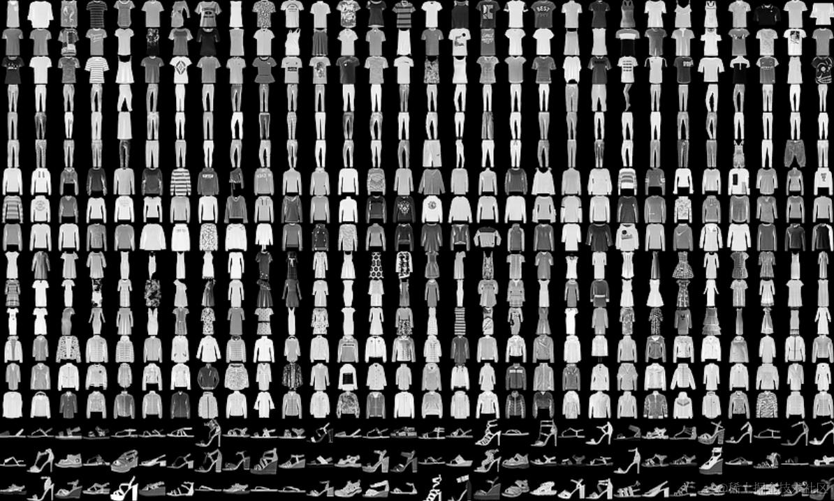 70000 张灰度图像,涵盖 10 个类别。以下图像显示了单件服饰在较低分辨率(28x28 像素)下的效果: