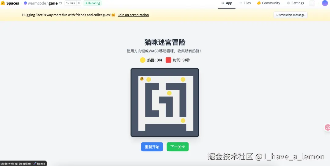 1. 选择模型,输入语言指令:生成一个迷宫游戏,主角是一只猫