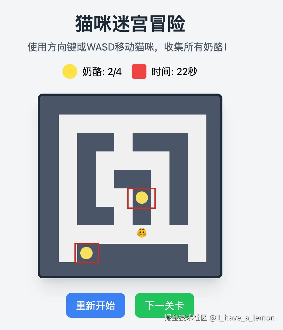 2. 预览运行效果后,实时调试和优化内容:奶酪要放在通路上,不能设置在墙体里,确保小猫在通路上都可以接触到所有奶酪