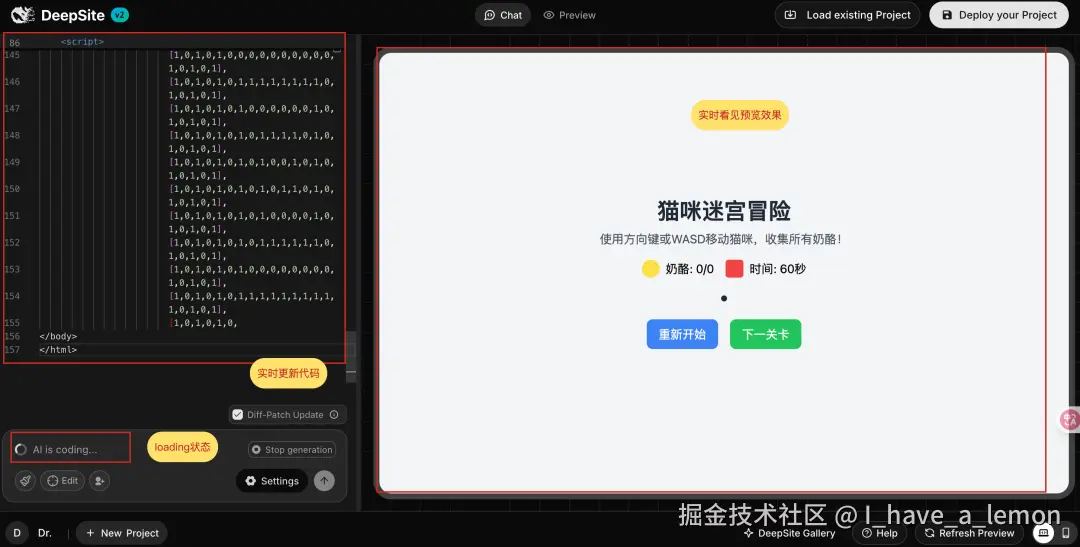 - 架构:前端接收指令 → 调用 DeepSeek API → 返回可运行代码 → 实时渲染