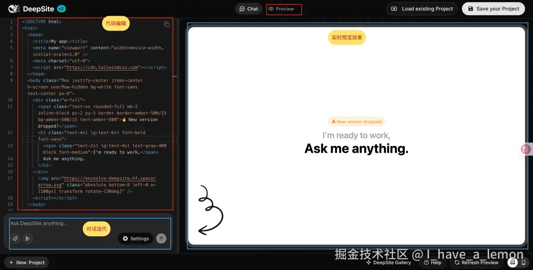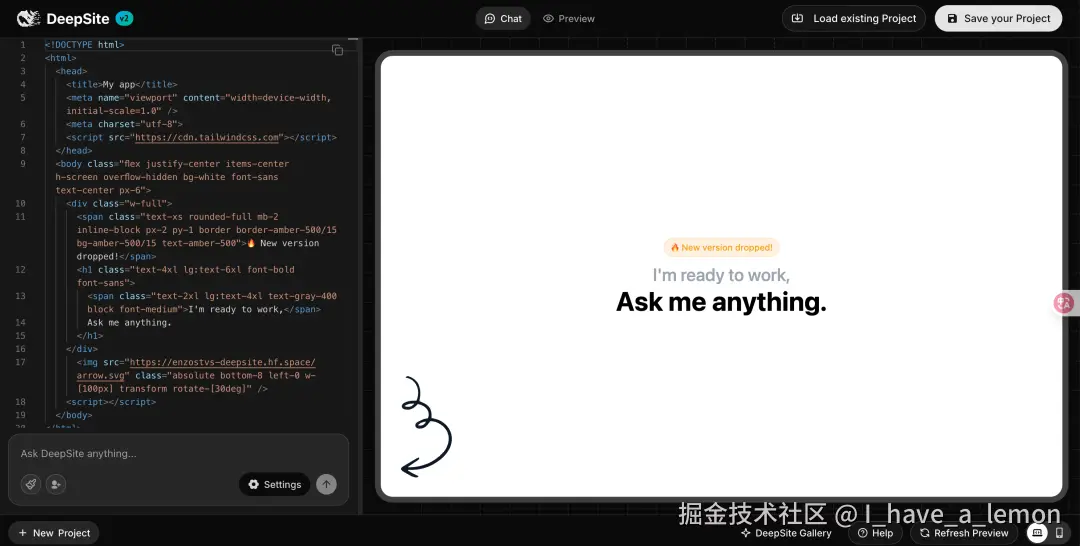 DeepSite的网页如下图所示,话不多说,我直接附上网页链接: enzostvs-deepsite.hf.space/projects/ne…