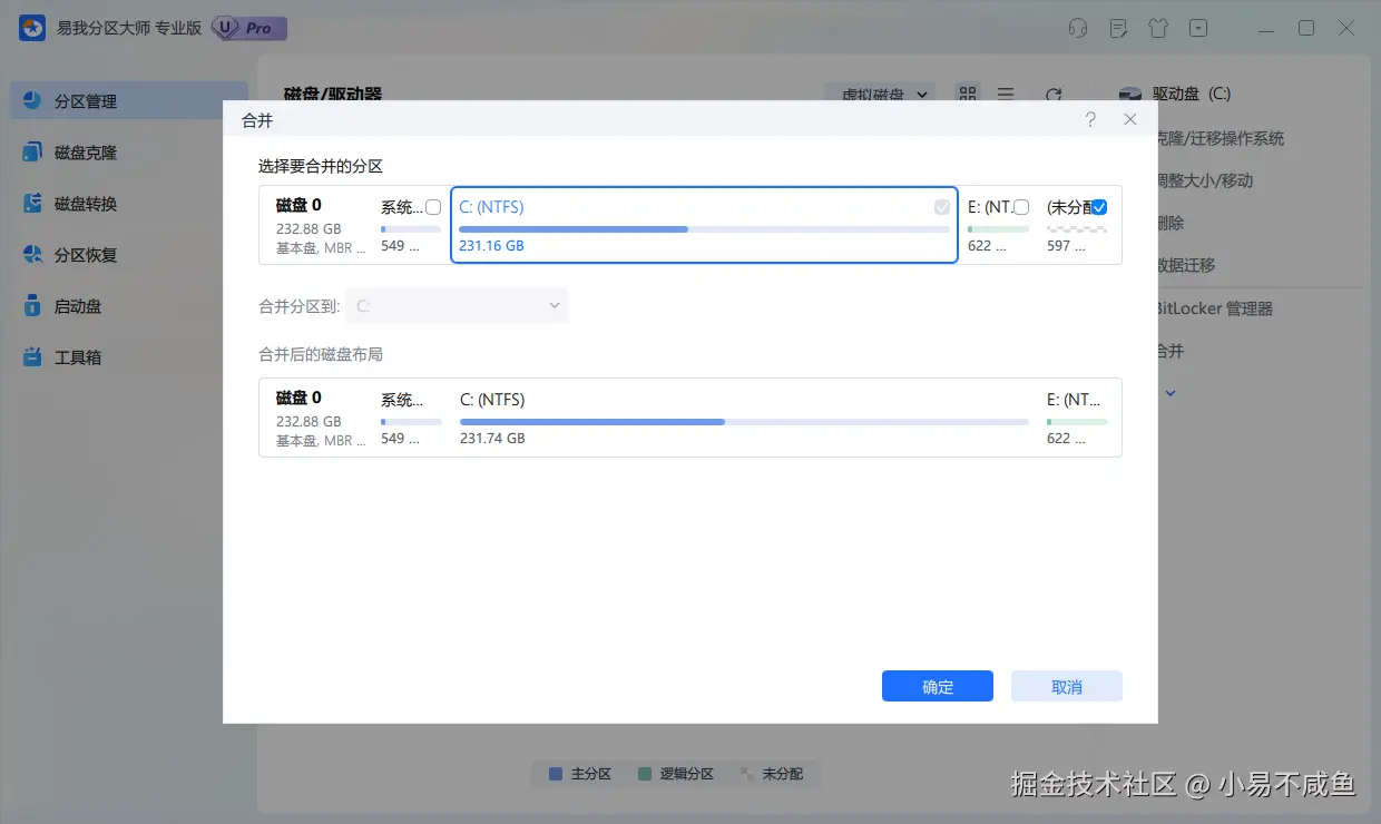 当然,通常来讲,想真正实现“C盘D盘合并不删除数据”,一般还是得靠专业的分区管理软件了,比如易我分区大师(EaseUS Partition Master Professional),这款软件能够轻松调整磁盘分区大小,且支持不相邻分区的合并,最为重要的是整个操作无损分区数据!软件操作界面简洁,非常适合广大用户自行进行分区调整。