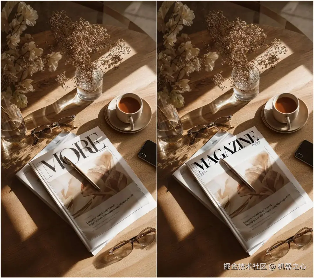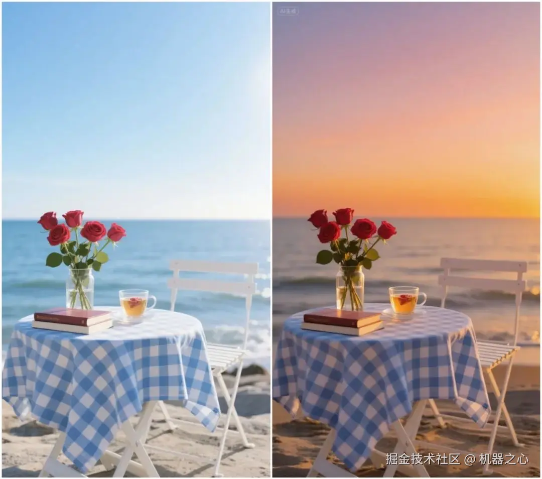 在完整保留海边静物原始构图的基础上,该模型精准重构黄昏暖色调光影,使蓝白格子桌布、玫瑰花与海面均自然镀上落日余晖。