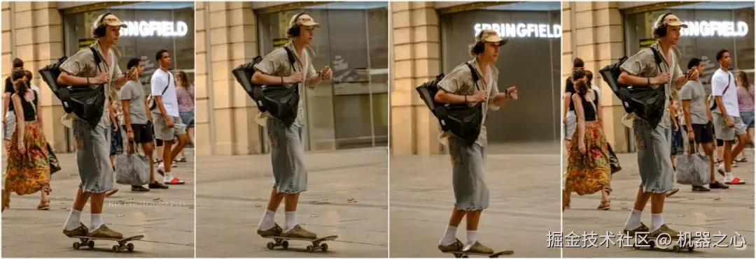 图 1: 原图;图 2: 豆包・图像编辑模型 3.0;图 3:GPT-4o;图 4:Gemini2.5 Pro;提示词:保留滑板男孩,删除画面中所有路人,并删除所有文字,其他元素不变