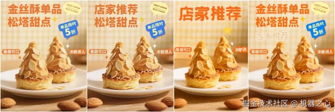 图 1: 原图;图 2: 豆包・图像编辑模型 3.0;图 3:GPT-4o;图 4:Gemini2.5 pro;提示词:把文字「金丝酥单品」改成「店家推荐」,其他元素不变