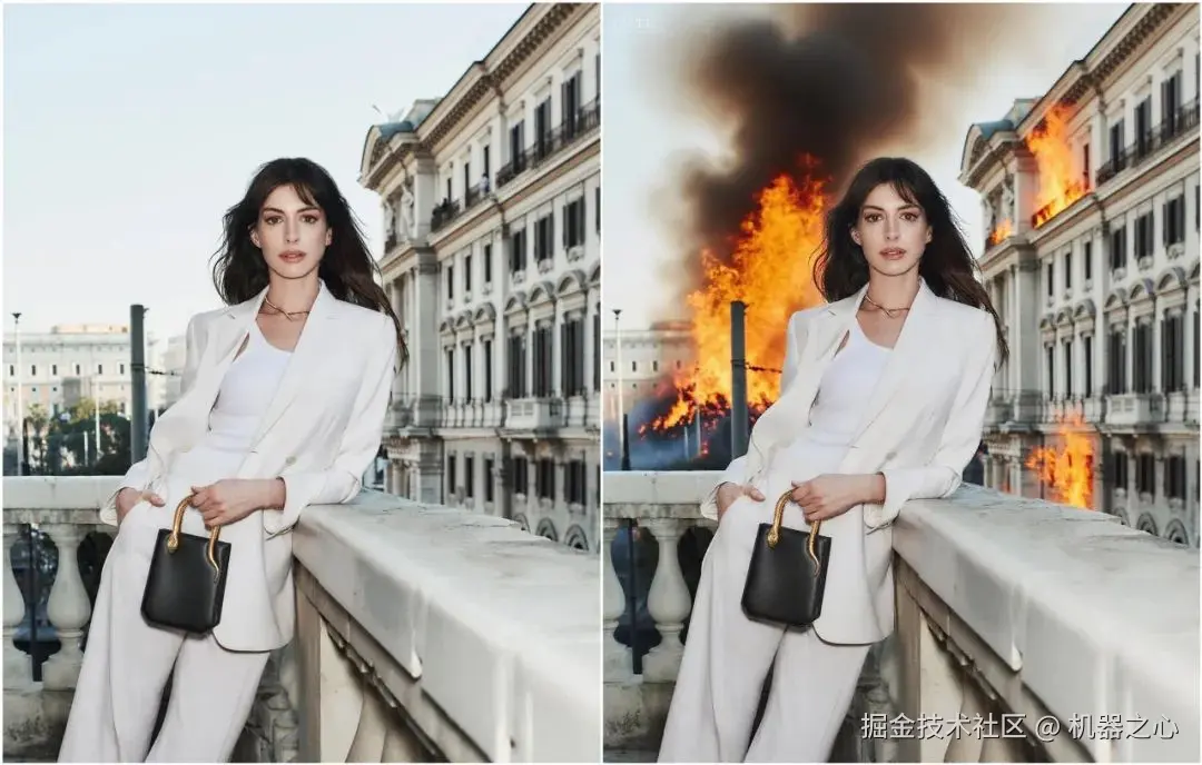 如果感觉画面平平无奇,想增加点元素提升视觉冲击,同样只需一句指令,就能让安妮・海瑟薇体验一把「房子着火我拍照」的刺激。