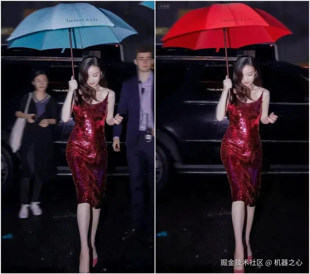 它还能同时处理消除路人、雨伞变色两项复杂任务。路人消失后背景自然补全,毫无 PS 痕迹;雨伞变色也严格锁定目标物体,未波及人物服饰或环境。