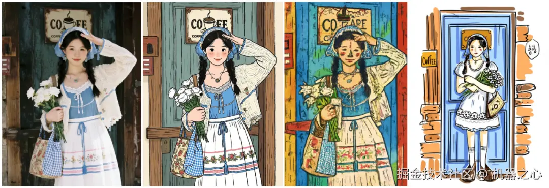 图 1: 原图;图 2: 豆包・图像编辑模型 3.0;图 3:GPT-4o;图 4:Gemini2.5 pro;提示词:保持背景结构,保持人物特征,风格改成涂鸦插画风格
