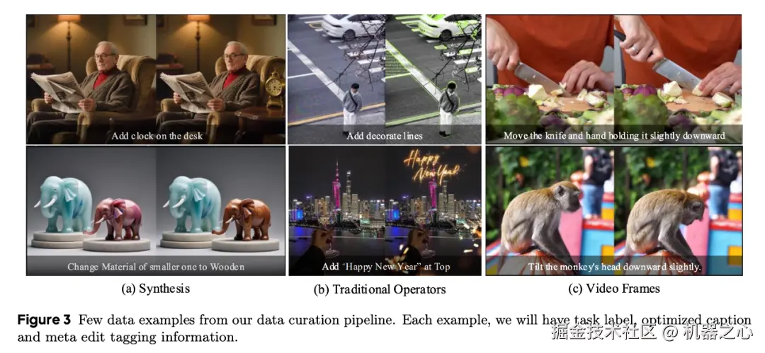 首先是数据层面,一方面引入多样化的数据源,包括合成数据集、编辑专家数据、传统人工编辑操作数据以及视频帧和多镜头数据,并包含了任务标签、优化后的描述和元编辑标记信息(下图)。而基于这些数据, 模型在真实数据与合成的「输入 - 输出编辑空间」中进行交错学习,既不损失各种编辑任务的信息,又提升对真实图像的编辑效果。