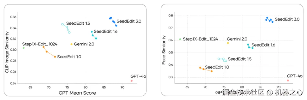 定量比较结果如下所示,其中左图利用 CLIP 图像相似度评估模型编辑保持效果,SeedEdit 3.0 领先于前代 1.0、1.5、1.6 以及其他 SOTA 模型 Gemini 2.0、Step1X 和 GPT-4o,仅在指令遵循方面不如 GPT-4o;右图显示 SeedEdit 3.0 在人脸保持方面具有明显优势。