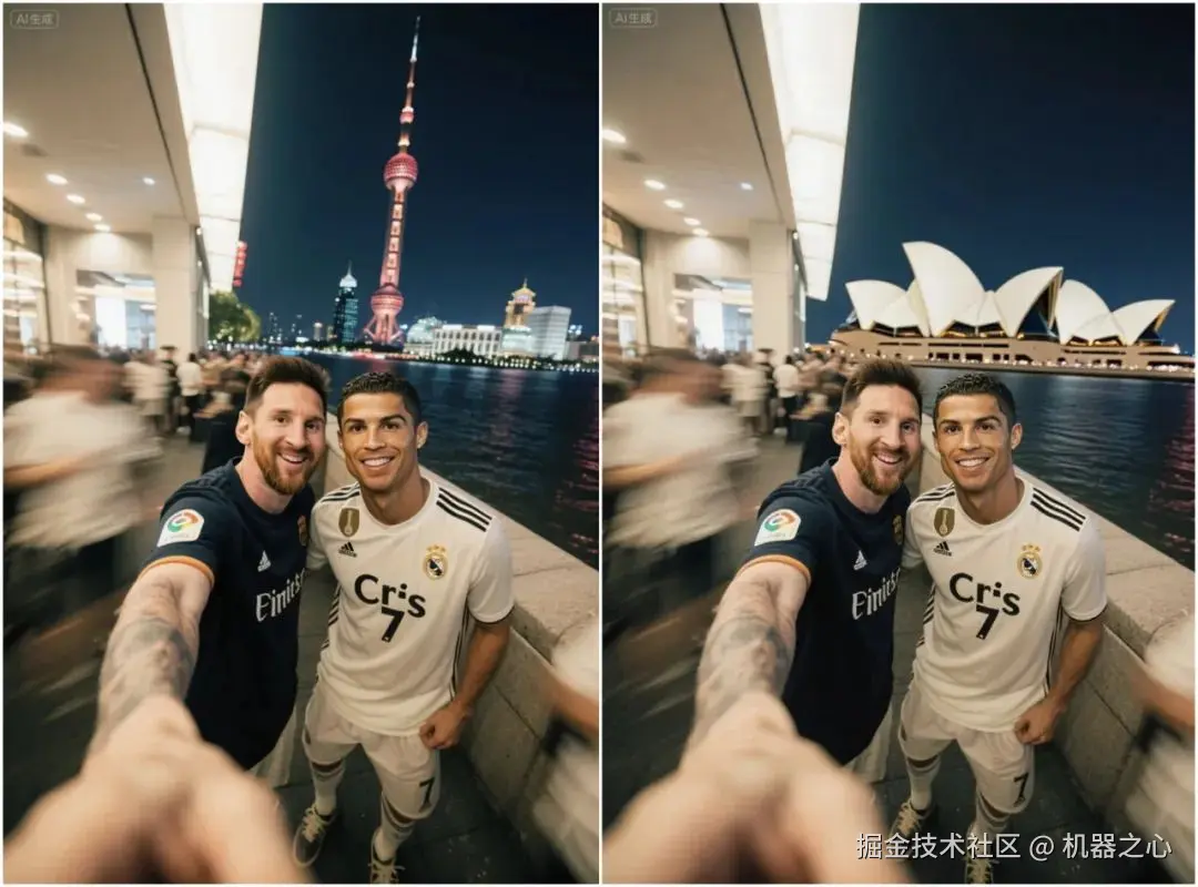再比如,把梅西和 C 罗自拍照的背景,从上海外滩瞬移至悉尼歌剧院,看来以后只要动动嘴就能打卡全球各大热门景点了。