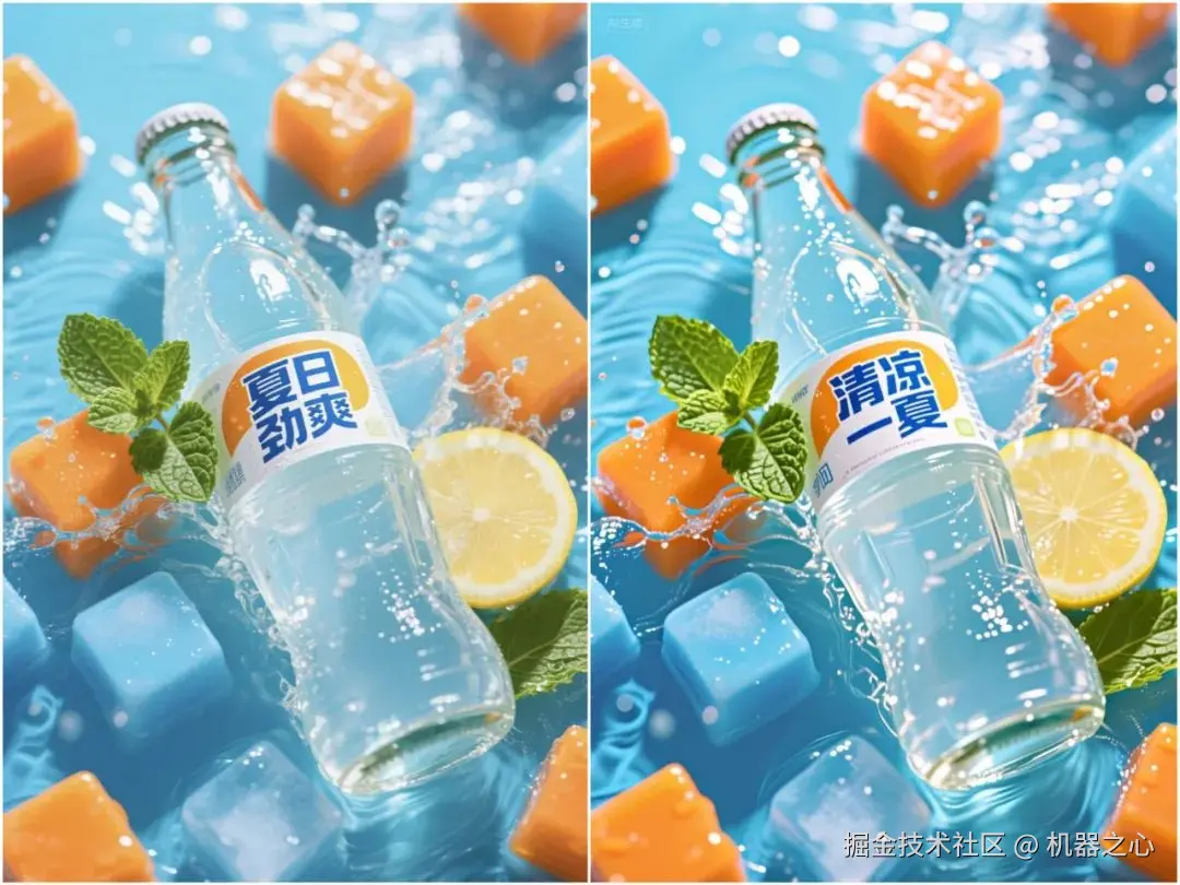 比如,把汽水瓶上的文字「夏日劲爽」改为「清凉一夏」,它不仅沿用原有字体设计,还保留了所有的背景元素。