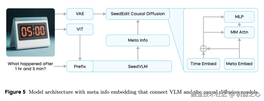 其次是模型层面,SeedEdit 3.0 沿用了 SeedEdit 的架构,底部视觉理解模型从图像中推断出高层次语义信息,顶部因果扩散网络充当图像编码器来捕捉细粒度细节。此外,视觉理解与扩散模型之间引入了一个连接模块,将前者的编辑意图(比如任务类型和编辑标签等)与后者对齐。