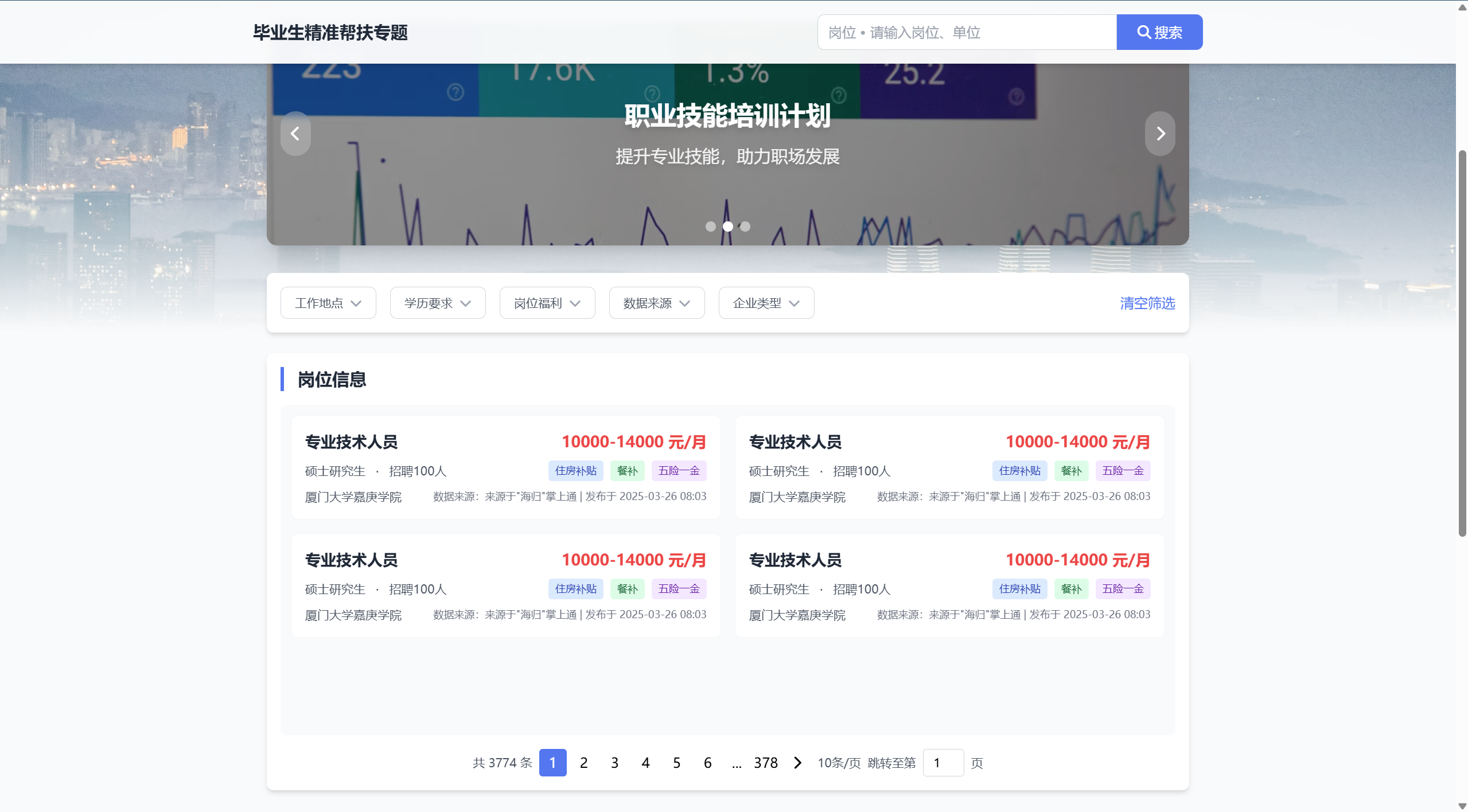 “这两张截图是同一个页面,简单描述一下这个页面就是:页面纵向可滑动,宽度大概是1200px,内容居中纵向排列,蓝色主题色为“#4b77f2”,从上到下依次是,1. 顶部搜索组件(包括主标题、搜索框+搜索按钮),2. 提示组件(包括完善信息提示、完善按钮),banner组件(包含banner图),3. 筛选项组件(包括多个筛选项:工作地点、学历要求、岗位福利、数据来源、企业类型,和一个清空筛选的文字按钮),4. 工作列表瀑布流组件(一行两列 ,固定高度大概800px,内容超出可纵向滚动,包含一个pagination翻页组件),5. 零工岗位瀑布流组件(同样是一行两列,固定高度大概800px,内容超出纵向运动,包含一个翻页组件)。根据截图和我的描述,优化提示词,使用TailWind CSS创建高保真UI原型,可从Unsplash获取图片素材,使用FrontAwesome等开源图标库,让原型更精美和接近真实。”