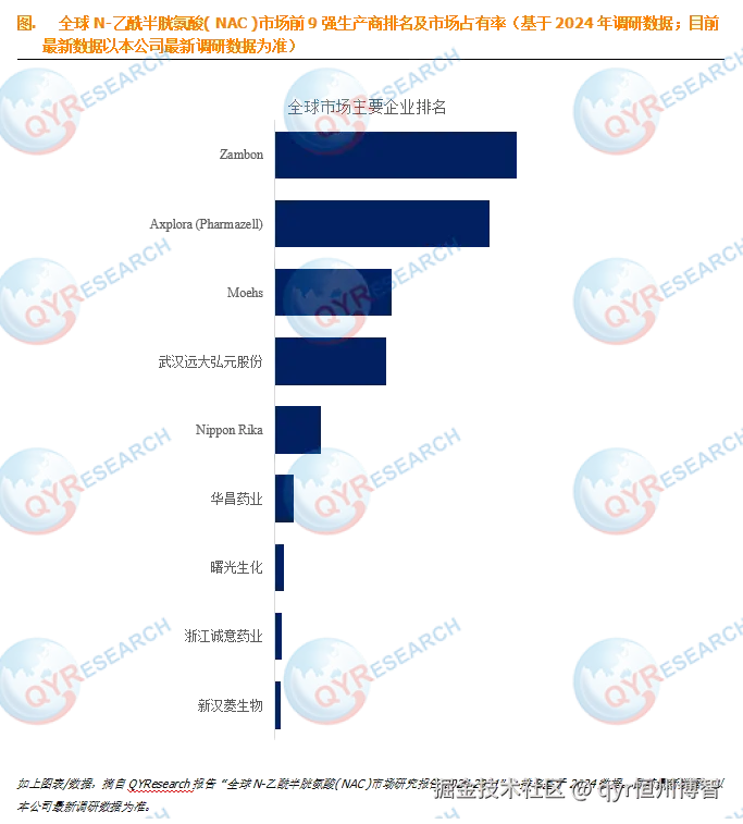 根据QYResearch头部企业研究中心调研,全球范围内N-乙酰半胱氨酸( NAC ) 生产商主要包括Zambon、Axplora (Pharmazell)、Moehs、武汉远大弘元股份、Nippon Rika等。2024年,全球前四大厂商占有大约74.0%的市场份额。