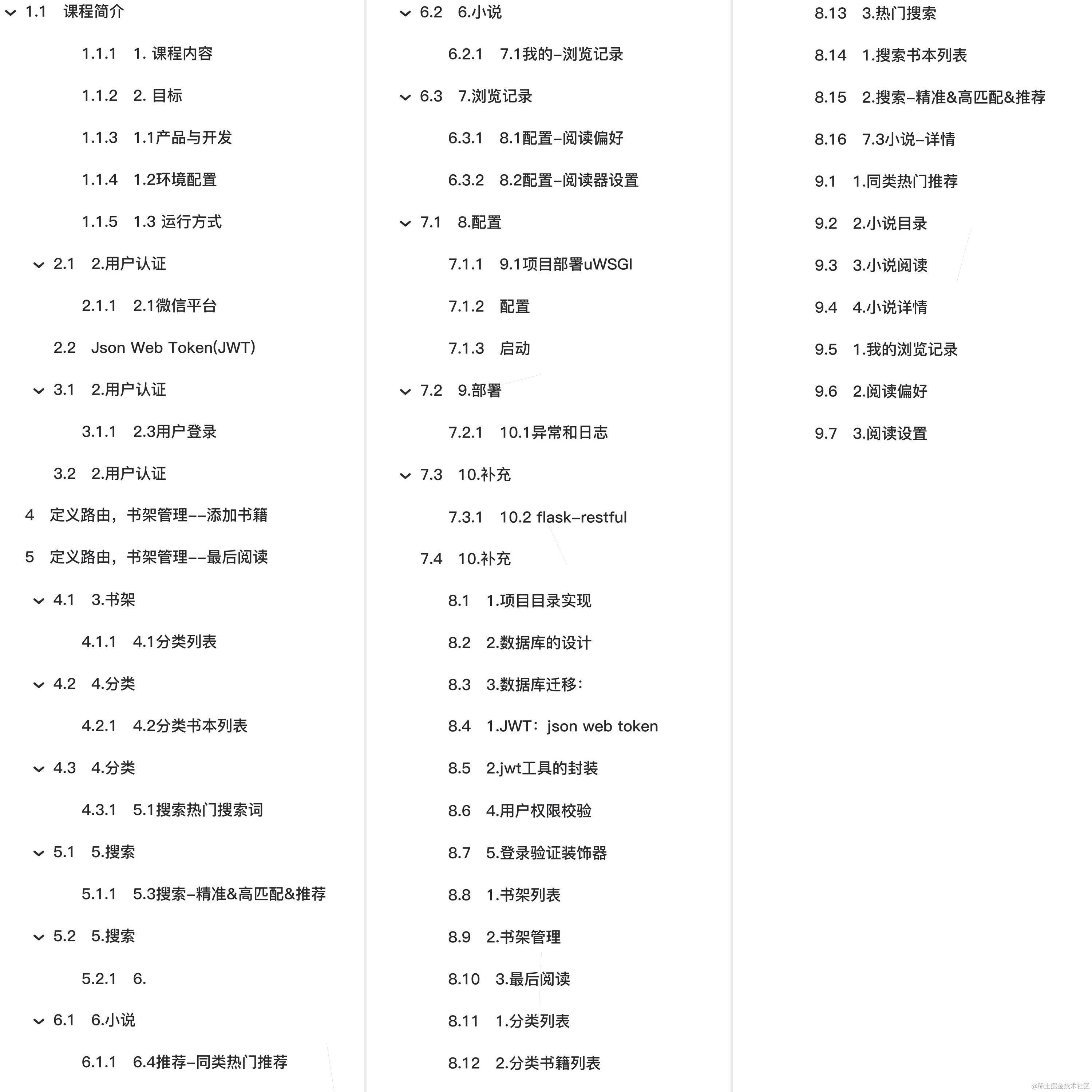 教程总体简介:课程简介、2.用户认证、Json Web Token(JWT)、定义路由、书架管理--添加书籍、书架管理--最后阅读、3.书架、4.分类、5.搜索、6.小说、7.浏览记录、8.配置、9.部署、10.补充
