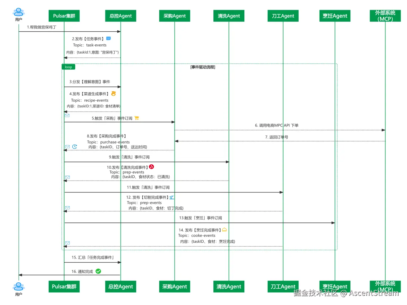 还是以制作宫保鸡丁这道菜为例,AI Agent与Pulsar交互的简易流程如下: