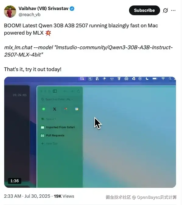 今日凌晨,Qwen 团队再度公布重磅更新——此前已经广受好评的 Qwen3-30B-A3B 模型迎来了新版本:Qwen3-30B-A3B-Instruct-2507。机器学习爱好者 Vaibhav (VB) Srivastav 第一时间分享了使用反馈:「最新的 Qwen3-30B-A3B-2507 在搭载 MLX 的 Mac 上运行速度极快」。