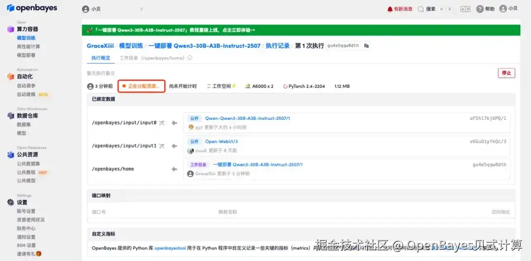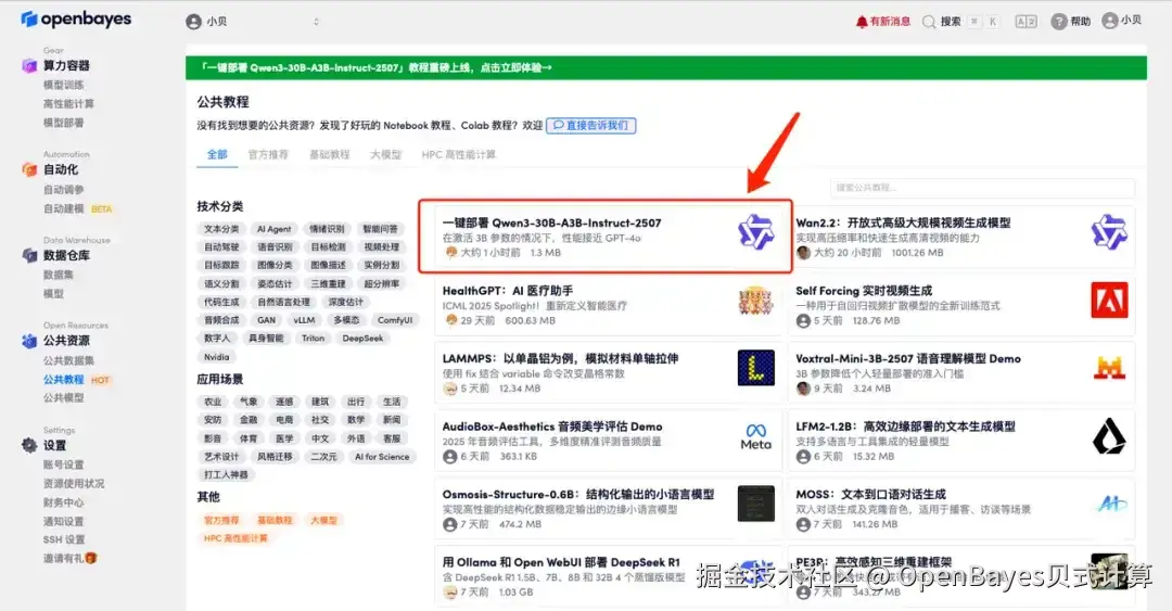 1.登录 OpenBayes,在「公共教程」页面,选择「一键部署 Qwen3-30B-A3B-Instruct-2507」教程。