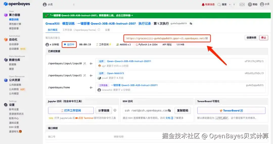 4.等待分配资源,首次克隆需等待 2 分钟左右的时间。当状态变为「运行中」后,点击「API 地址」旁边的跳转箭头,即可跳转至 WebUI 页面。请注意,用户需在实名认证后才能使用 API 地址访问功能。