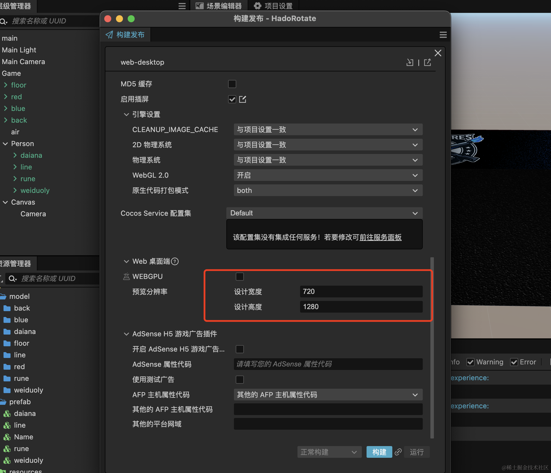 cocos打包web端需要注意的地方 1024小神 2025-07-30 115 阅读1分钟 打包的时候,这里的预览分辨率要和设计分辨率保持一致,否则打包出来的内容会发生错位,比如3d场景下的昵称跟随组件会出现偏差 还要注意打开后的项目自带有项目名称,需要点击一下游戏场景图,然后才会出现完整的尺寸大小,这个时候再创建人物角色和昵称跟随,应该就可以了: 点击下面的红框: 就会出现完整的游戏界面: