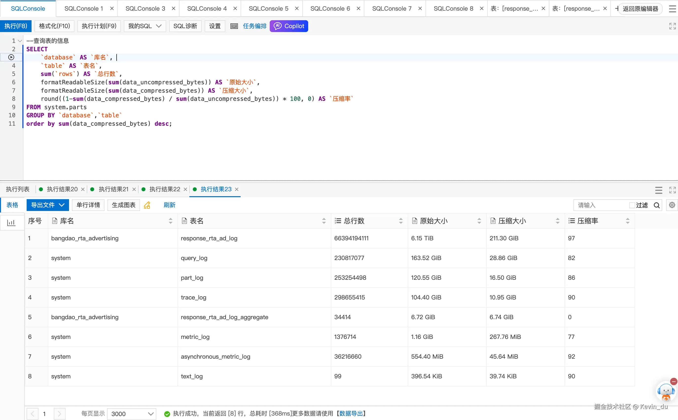 formatReadableSize(sum(data_compressed_bytes)) AS `压缩大小`,