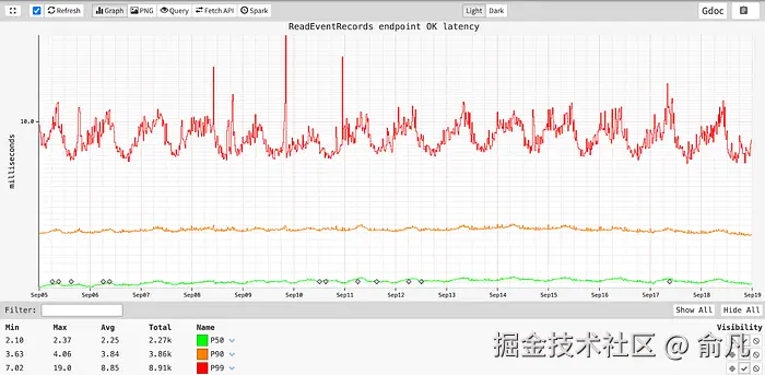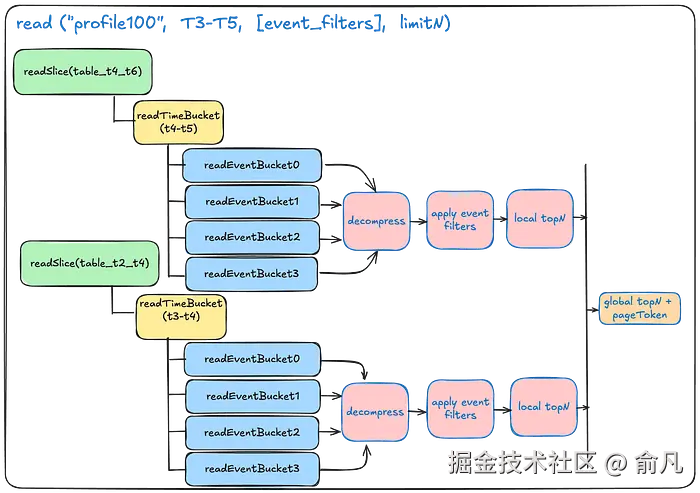 所有读操作都从默认的扇出因子开始,同时并行扫描 8 个分区桶。然而,如果服务层判定时间序列数据集较为密集(即大多数读取操作可以通过读取前几个分区桶来满足),就会动态调整未来读取操作的扇出因子,以减少底层数据存储上的读取放大现象。相反,如果数据集较为稀疏,则可能会适当提高限制值,并设置一个合理的上限。