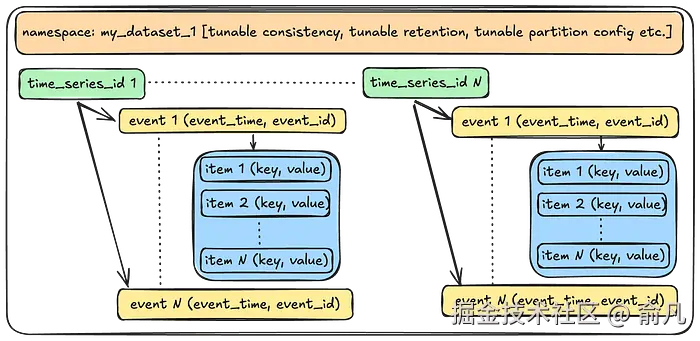 - 命名空间(Namespace):命名空间是一个时间序列 ID 和事件数据的集合,代表完整的时间序列数据集。用户可以为每个用例创建一个或多个命名空间。这种抽象在命名空间级别应用了各种可配置选项,我们将在探讨服务的控制平面时进一步讨论这些选项。