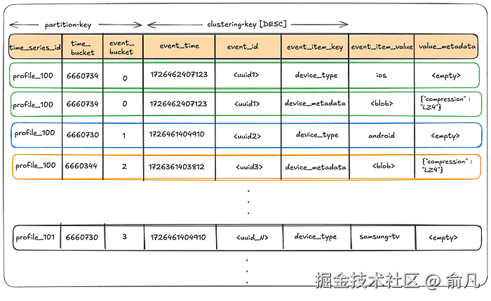 分区键能够根据 时间桶(time_bucket) 和 事件桶(event_bucket) 对 时间序列 ID(time_series_id) 所对应的事件进行分组,从而缓解热点分区问题。而聚类键则使我们能够将数据按我们通常希望的顺序(几乎总是这样的顺序)存放在磁盘上进行排序。元数据值(value_metadata) 列则存储了 事件项值(event_item_value) 的相关元数据,例如压缩信息。