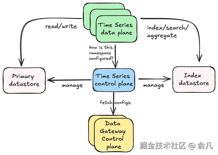 数据面负责执行读取、写入操作,而控制面则配置命名空间行为的各个方面。数据面与时间序列控制栈进行通信,该栈负责管理配置信息。反过来,时间序列控制栈与共享的数据网关平台控制面进行交互,后者负责监督所有抽象以及命名空间的控制配置。