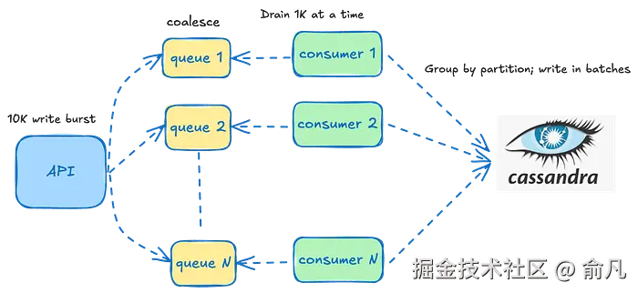 我们经常利用这项服务来处理突发性工作负载。我们不会一次性将负载全部施加到底层数据存储上,而是希望通过让事件在较短时间内(通常为几秒)聚集起来,以便更均匀的分配负载。事件会累积在每个实例的内存队列中,专门的消费者会持续从队列中提取数据,按照其分区键对事件进行分组,并将写入操作批量发送到底层数据存储中。