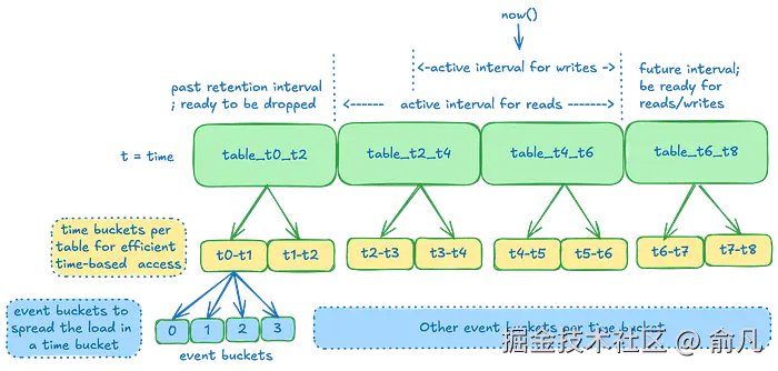 时间切片(Time Slice):时间切片是保留数据的单位,直接映射到 Cassandra 表。我们创建多个这样的时间切片,每个切片覆盖一个特定的时间间隔。事件根据 event_time 落在其中一个切片中。切片无缝连接在一起,操作包括开始时间但不包含结束时间,确保所有数据都位于其中一个片中。